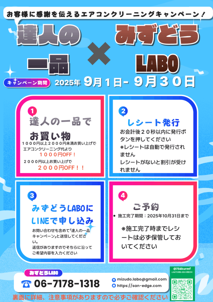 本日より達人の一品尼崎店と9月末までのエアコンクリーニングキャンペーンを開催したします!内容としましては「達人… 続きを読む: 達人の一品 尼崎店×みずどうLABOキャンペーン! - 窓用エアコンのお問い合わせ急増!ご無沙汰しております、みずどうLABOでございます。いつもみずどうLABOをご利用いただきありがとうございます… 続きを読む: 窓用エアコンのお問い合わせ急増!