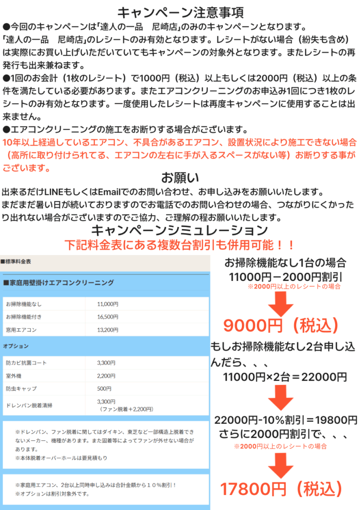 内容としましては「達人の一品 尼崎店」でお買い物していただくとお買い上げいただいた金額に応じてエアコンクリーニングが